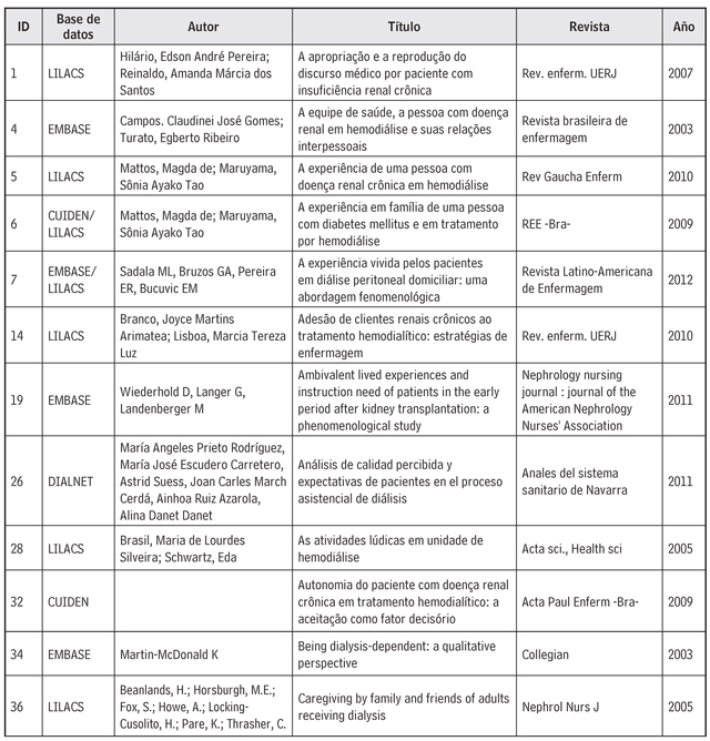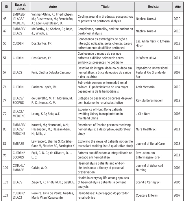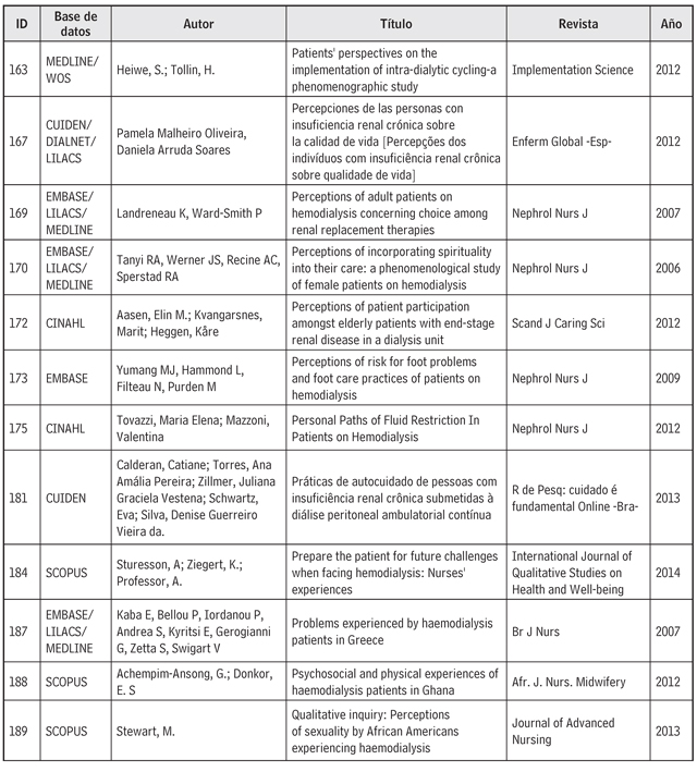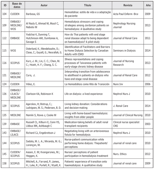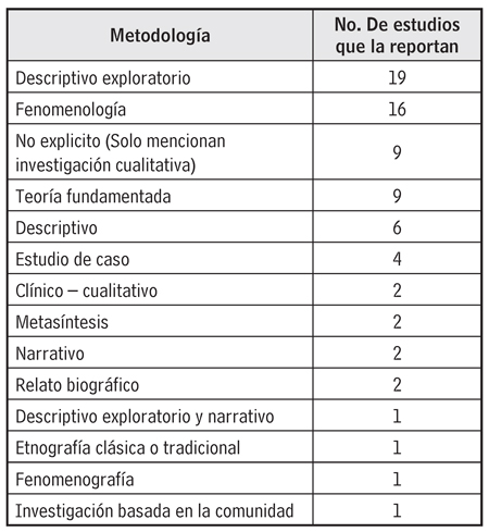 Las búsquedas iniciales arrojaron 1.999 documentos, después de remover los artículos duplicados se obtuvieron 1.197; se seleccionaron por título y resumen 252, cuyos textos completos fueron recuperados para lectura detallada y exhaustiva. De esta selección, 103 artículos fueron evaluados siguiendo la propuesta CerQualy; según la evaluación por pares, 78 cumplían con la calidad metodológica, de ellos 3 no cumplían los criterios de coherencia, relevancia y suficiencia de datos. Finalmente, se integraron 75 estudios (Anexo); de estos, 52 exploraban experiencias relacionadas con hemodiálisis (HD), 10 con diálisis peritoneal (DP), 6 con trasplante, 6 con DP y HD conjuntamente, y uno exploró los 3 TSFR. El rango de fechas de publicación estuvo entre los años 2003 y 2017. Se identificaron 14 metodologías diferentes (tabla 2), dentro de estas, la fenomenología fue descrita desde 9 perspectivas distintas (tabla 3).