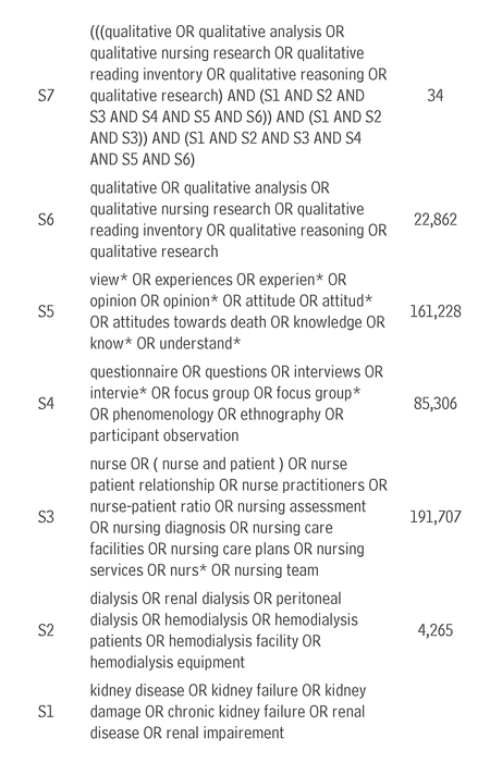 Para identificar y recuperar los estudios se construyó una estrategia de búsqueda electrónica basada en descriptores MeSH y DeCS relacionados con TSFR e investigación cualitativa, que fueron organizados en diversas ecuaciones incluyendo operadores boléanos AND y OR, las ecuaciones se adecuaron al lenguaje documental de cada base seleccionada con el ánimo de identificar la mayor cantidad de estudios. Las búsquedas se realizaron desde el servidor de la Fundación Universitaria de Ciencias de la Salud de Bogotá.