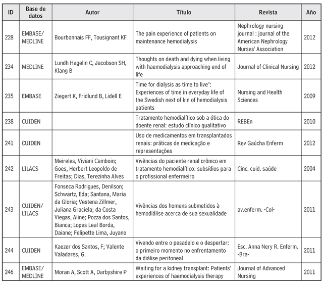 Según Gálvez (10), cuando se trata de problemas de la práctica asistencial relacionados con dimensiones socioculturales, o que dan cuenta de la heterogeneidad de las respuestas humanas en los procesos salud-enfermedad, como es el caso de la IRC y los TSFR, se dispone de abundantes estudios cualitativos, recuperables y posibles de sintetizar para obtener respuestas aplicadas que ayuden a la toma de decisiones; afirma, además, que las metasíntesis son el camino hacia el cual debe dirigirse la búsqueda de evidencias. Al compartir esta premisa, se propuso sintetizar en términos de evidencias-Q, hallazgos derivados de estudios cualitativos frente al tema de los TSFR.