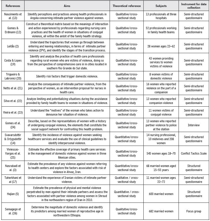 The most frequent descriptors were: Domestic violence/Violence against Women/Intimate partner violence/Women’s health. As for data collection, semi-structured questionnaires were used in nine studies and structured interviews in three. There were two focus groups, while two studies used the Conflict Tactics Scale and the Multi-country Study on Women’s Health and Life Experiences Questionnaire, both of which are validated instruments. One study based data collection on an interview.