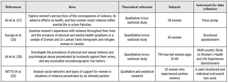 In terms of age groups, the respondents were between 15 and 72 years old. Six of the studies addressed only domestic violence; five addressed domestic violence; four dealt with physical and psychological violence, and three focused on sexual violence. Table 2 shows some of the data analyzed.