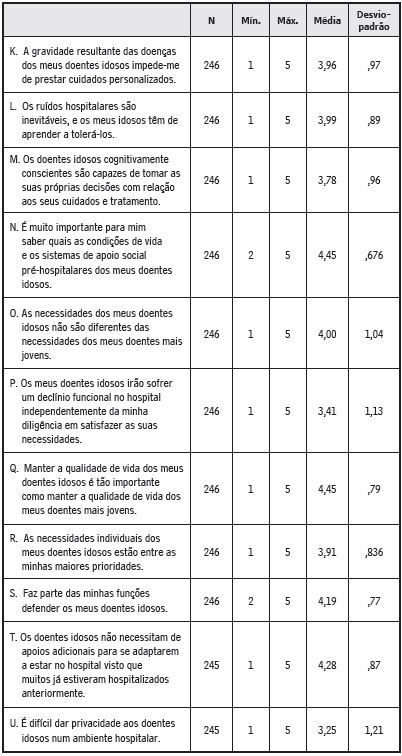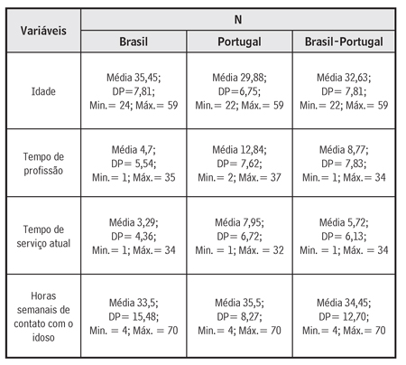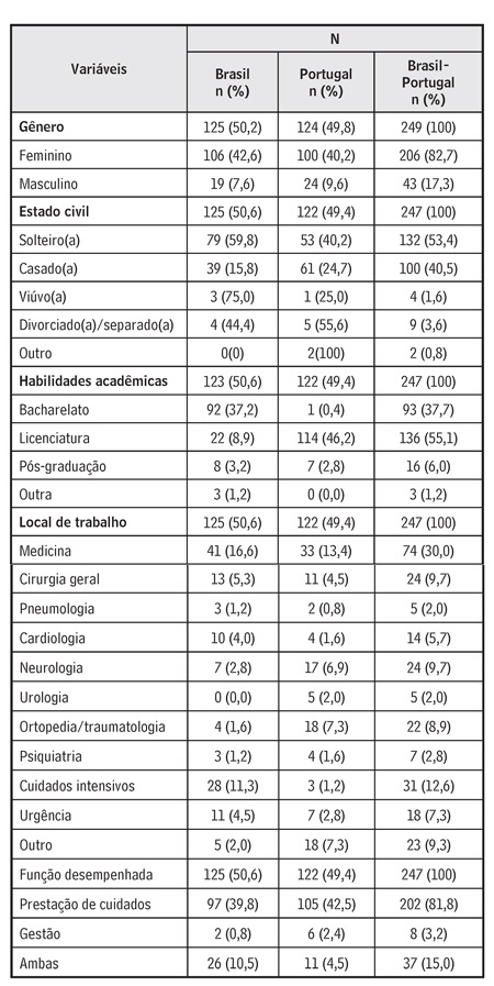 Participaram no último estágio, V, teste da versão adaptada (pré-teste), 249 enfermeiros que cuidam ou cuidaram de idosos hospitalizados em fase aguda, sendo 125 (50,2 %) de nacionalidade brasileira e 124 (49,8 %) de nacionalidade portuguesa. 206 enfermeiros eram do sexo feminino, e a média de idades foi de 32,63 (DP=7,81), mínimo de 22 anos e máximo de 59 anos. A maioria dos participantes é composta por solteiros (n=132; 53,2 %), licenciados em enfermagem (n=136; 55,1 %), exercia funções em serviços de medicina (n=74; 30 %) e prestava cuidados diretos (n=202; 81,8 %). A média de tempo de profissão era de 8,77 anos (DP=7,83), com um mínimo de 1 ano e um máximo de 37 anos. A média de tempo no serviço atual era de 5,62 anos (DP=6,13), mínimo de 1 ano e máximo de 34 anos. O tempo médio de contato semanal com idosos era de 34,45 horas (DP=12,70), mínimo de 4 horas e máximo de 70 horas, tal como apresentado nas Tabelas 1 e 2.