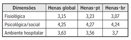 Com relação às dimensões definidas na versão original, a saber: fisiológica, psicológica/social e ambiente hospitalar, observamos que, tal como apresentado na Tabela 4, os valores são muito aproximados entre os participantes de Portugal e do Brasil. A dimensão psicológica/social apresenta valores médios mais elevados, e a dimensão fisiológica, os valores médios mais baixos.