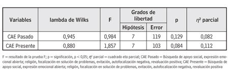 Con respecto a los contrastes multivariados realizados con las estrategias de afrontamiento actuales (tabla 1) tampoco se puso de manifiesto la existencia de efectos principales del sexo en el afrontamiento general (Lambda de Wilk’s=0,880; F (7,103)=1,857; p=0,084; η2=0,112). Aunque en este caso hay que tener en cuenta el tamaño del efecto pues este es bastante alto, dado que el género explica el 11,2% de la varianza. Debido a que el tamaño del efecto es relevante en este caso particular, y que la muestra no es excesivamente elevada, en el caso de las estrategias en el presente sí se pasará a analizar mediante Anovas de continuación el detalle de cada una de las estrategias empleadas.