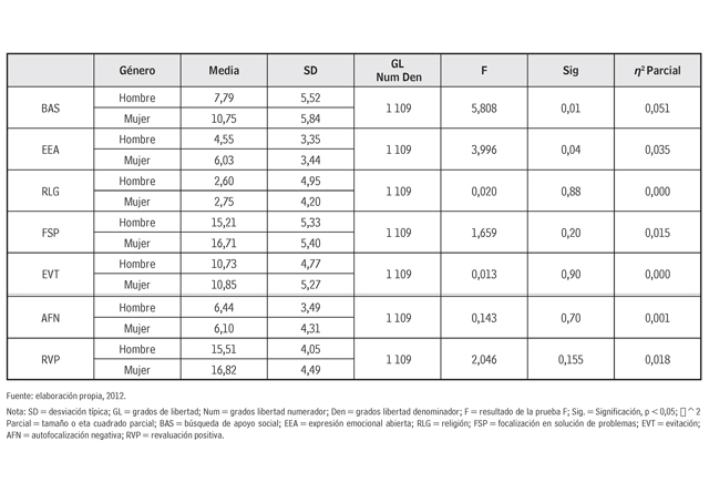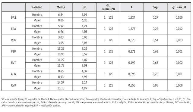 Los Anova de continuación indicaron que existían diferencias significativas en función del sexo en las estrategias: búsqueda de apoyo social: F (1,109)=5.808; p=0,018; η2=0,051, y en expresión emocional abierta: F (1,109)=3.996; p = 0,048; η2=0,035). En concreto, las mujeres utilizan más estrategias de búsqueda de apoyo social y de expresión emocional para afrontar las situaciones de estrés general y así adaptarse a las situaciones. Las mujeres tenían mayores puntuaciones medias que los hombres en ambas estrategias.