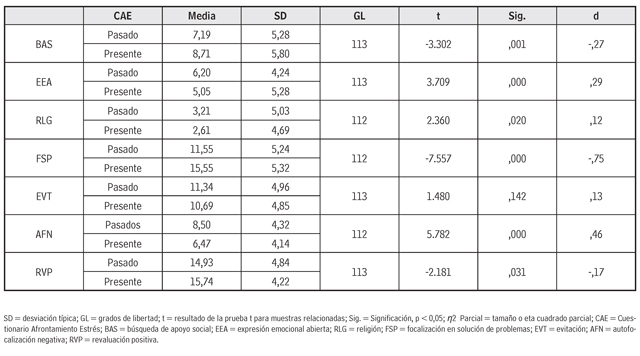 La mayor diferencia se encuentra en la focalización en solución de problemas (t=-7,55; p≤=0,001; d= -0,756), que se usa mucho más en el afrontamiento actual y en los problemas cotidianos, que en el afrontamiento pasado. Y también en la autofocalización negativa (t=5,78; p≤=0,001; d=0,466) en la que sucede todo lo contrario.