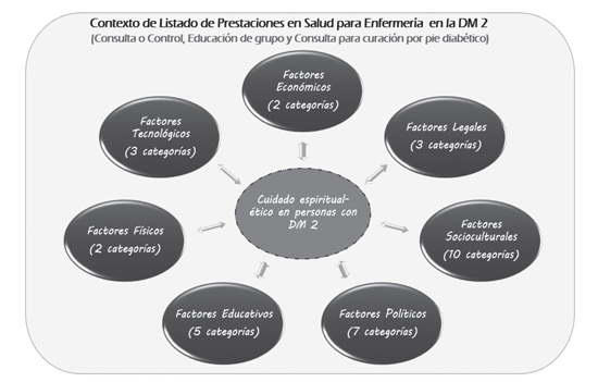 Al considerar el cuidado de personas con diagnóstico de DM 2 en el contexto de la Teoría de la Atención Burocrática, se debe entender que el cuidado es el todo, pero, asimismo, es parte de la complejidad organizacional 15 de la atención primaria de salud. De esta manera, el cuidado de enfermería se enfrenta a una relación con factores de la burocracia propia al centro de salud familiar. El referente filosófico del estudio define un proceso relacional transcultural complejo, asentado en un contexto ético y espiritual, con múltiples entradas en el sistema, interconectadas con el cuidado en el conjunto de la cultura de la organización 16. De esta manera, el cuidado de enfermería en pacientes con DM 2 se enfrenta a factores propios del establecimiento de salud.