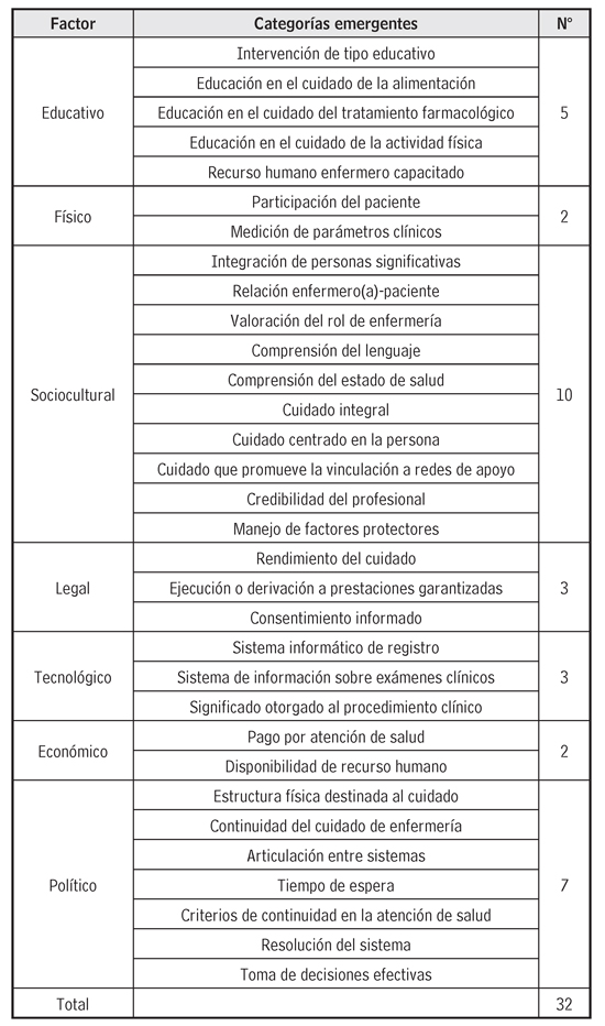 La tabla 1 incorpora las categorías emergentes según factor, que representan las características de la práctica del cuidado de enfermería en el paciente con DM 2.