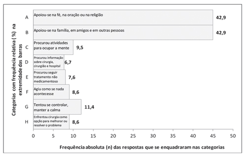 O Suporte social se destacou no IEC e refere-se à busca por suporte emocional ou informativo 30. Paralelamente, nessa amostra, Apoio da família, dos amigos e de outros também se sobressaiu entre os relatos (42,9 %), o que corrobora resultados da literatura 32. Quanto ao domínio Resolução de problemas, ao observar seu destaque no IEC, compreendeu-se que, para essa amostra, a realização do procedimento cirúrgico parece ter significado de resolução da obstrução coronariana, o que corrobora resultados da literatura 33.