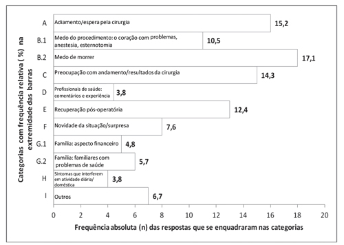 “Adiamento ou a espera pela cirurgia” também se destacou (15,2 %) entre os estressores relatados e evidenciou o desejo de realização do procedimento o mais breve possível, o que é consistente com os achados da literatura 32-33. Essa categoria talvez tenha se destacado nessa amostra pelo desejo de resolução do problema. Porém, o paciente se depara com a realidade dos serviços públicos de saúde, nos quais o tempo entre a indicação cirúrgica e a realização do procedimento pode demorar alguns meses e superar a expectativa do paciente.