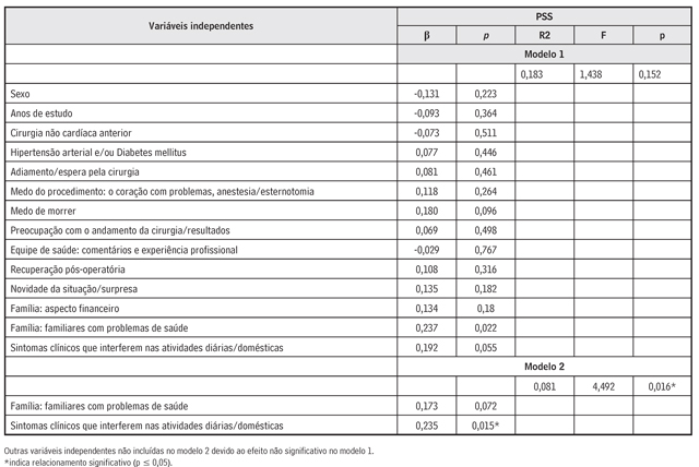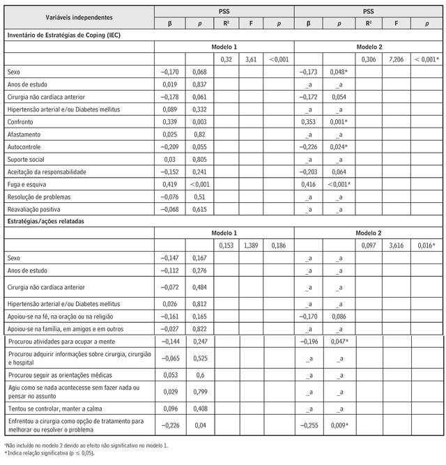 Variáveis demográficas e clínicas quantitativas foram descritas por estatísticas sumárias; as qualitativas, por frequência absoluta e relativa. A relação entre níveis de estresse percebido com estratégias de coping e com estressores foi verificada por regressão linear multivariada, em que variáveis qualitativas foram representadas com: 0 para feminino e 1 para masculino; 0 para até 8 anos de estudo e 1 para 9 anos ou mais; 0 para ausência de cirurgias prévias (não cardíacas) e 1 para presença; 0 para ausência de hipertensão arterial e/ou diabetes melittus e 1 para presença. De forma semelhante, para cada categoria de estressor e para cada categoria de ação que ajudou a enfrentar o pré-operatório, atribuiu-se 0 para não (citado) e 1 para sim (citado). Valores de p < 0,05 foram considerados estatisticamente significantes.