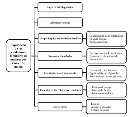 1. Familia. Es la red de apoyo más sobresaliente, con diversas funciones y situaciones según el contexto 9,20,22,26,27,34. Ya sea desde el momento del diagnóstico, después de la cirugía 34, o en los momentos de tensión 26, la familia interviene en la experiencia de los cuidadores; existe una relación de apoyo mutuo 20,22. Se identifica una relación de apoyo bidireccional, en donde la mujer en su condición de enfermedad mantiene una participación activa para lograr el afrontamiento familiar 20,29.