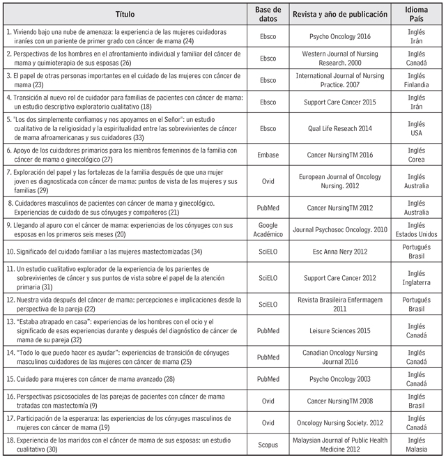 Se identificaron 493 artículos, de los cuales 18 cumplieron los criterios de inclusión para conformar la muestra de esta revisión integradora. Se caracterizó cada uno de los artículos seleccionados y se realizó un análisis exhaustivo de los contenidos; se elaboró una matriz de análisis con los siguientes datos: título, año, país de origen, objetivo, métodos, categorías identificadas, características de los cuidadores, discusión, conclusiones y referente teórico, como se observa en la tabla 1.