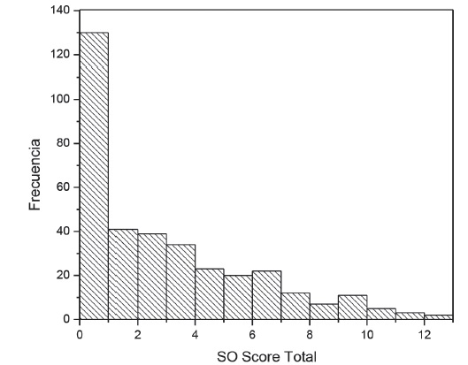 Para verificar la normalidad, a la muestra de puntajes totales se le aplicó el test de Kolmogorov-Smirnov, el cual mostró un nivel de significancia de 0,05, por lo que los datos no están distribuidos normalmente (figura 1).