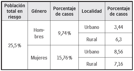 Resultados: no existen diferencias en el riesgo de suicidio según localización geográfica, pero sí por género; se presentó un 15,76 % de adolescentes femeninas con riesgo suicida.