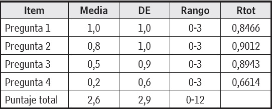 La puntuación media de todos los ítems fue 0,6 con un mínimo de 0,2 y un máximo de 1,0. La tabla 3 muestra el rango por ítem y el Rtot de Pearson que indica que todos los ítems presentan una altísima correlación con la puntuación total.