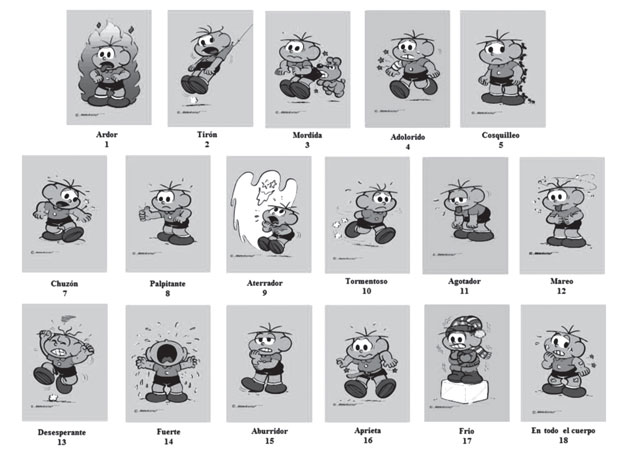 Entre los instrumentos que evalúan el dolor de una manera multidimensional se destaca el Instrumento tarjetas de cualidad del dolor (ITCD) 9, construido en Brasil en 1996 a partir del McGill Pain Questionnaire. El instrumento contiene dieciocho descriptores de cualidad del dolor, acompañados por una representación gráfica con el personaje Cebollita (diseños elaborados por Maurício de Souza produções S.A), que facilita la calificación por la población infantil.