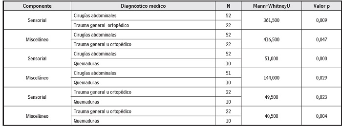 Diagnóstico médico: según la tabla 1, los componentes sensorial y misceláneo diferenciaron el grupo de niños con trauma general u ortopédico del grupo de niños con cirugías abdominales.