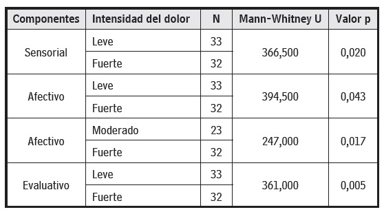 Intensidad del dolor: se constató correlación estadísticamente significativa entre la intensidad del dolor del niño y la elección de las tarjetas, la cual fue estadísticamente significante en los componentes sensorial (r = 0,254; p = 0,015), afectivo (r = 0,232; r = 0,028) y evaluativo (r = 0,227; p = 0,031). También se compararon las categorías de intensidad del dolor (1 a 3 = leve; 4 a 6 = moderado; 7 a 10 = fuerte) con la elección de tarjetas. Según la tabla 3, los componentes sensorial, afectivo y evaluativo diferenciaron significativamente el grupo de niños con dolor fuerte del grupo de niños con dolor leve.