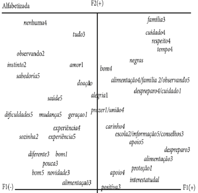 Em relação ao fator 2, apreende-se que as representações de mulheres migrantes da 1a geração e alfabetizadas para o estímulo 1, e mulheres migrantes da 3a geração, verificou-se que a amamentação se ancora na vinculação afetiva e de amor entre o binômio e de dedicação entre as mulheres das diferentes gerações. Cabe entender que o processo geracional envolve fenômenos que vão desde a posição familiar, partilhas sociais e históricas, até o mecanismo de agrupamento social e cultural.