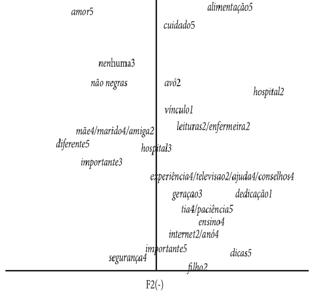 Por sua vez, nas evocações F1(-) das mulheres migrantes da 1a geração e não negras, a mãe é a principal figura de apoio dentro da família, o que pode ser justificado pela maior proximidade afetiva entre ambas. Essa relação afetiva contribui para o sentimento de confiança que a nutriz direciona à sua mãe, avó, sogra ou demais membros de sua conformação familiar.