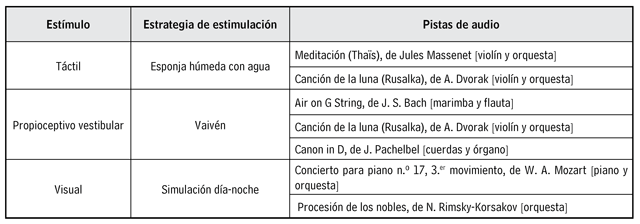Según los planteamientos de Aguilar 17, Prieto 19, Bello 28, Lobato 29, Federico 30 y Begoña 31, y la asesoría del ingeniero mecánico-músico, se seleccionó la música de acuerdo con las características de tonalidad, ritmo e instrumentos que cumplieran con los estándares de la estimulación: para el primero, música suave y relajante, que inspirara sentimientos de amor; para el segundo y tercer trimestre, música que facilitara las acciones ocupacionales. Los coordinadores del servicio donde se aplicó la intervención y el coordinador de derechos digitales de SAYCO avalaron la utilización de la música en este tipo de intervención.