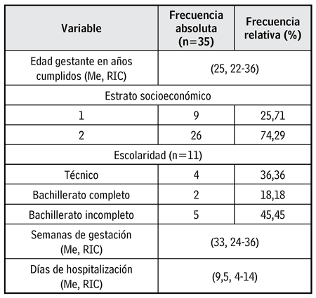 En la primera fase (caracterización sociodemográfica de las madres y sus condiciones obstétricas) participaron 35 madres gestantes con edades entre 18 y 41 años. La mitad de ellas tenía menos de 33 semanas gestacionales, y el diagnóstico más prevalente fue la preeclampsia no severa (50 %), seguido por la preeclampsia severa (30 %) (tabla 2).