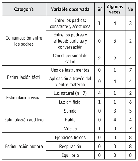 Las observaciones no participantes realizadas al inicio mostraron que los padres se comunicaron con los profesionales de la salud, y entre ellos en una menor cantidad de ocasiones; la mayoría de las interacciones se realizaron mediante caricias y conversaciones con el bebé en gestación. Por otro lado, la estimulación más practicada fue la visual, con iluminación natural, auditiva mediante el habla, y táctil con aplicación a través del vientre materno. No se apreció la aplicación de técnicas como el ejercicio, la respiración, el equilibrio u otras que permitieran la estimulación motora del feto (tabla 3).