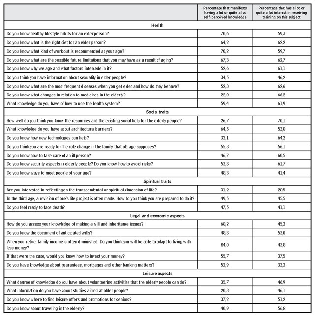 Results: About a 60 % of the respondents showed interest in receiving training about; healthy habits (59,1 %), proper diet (62,0 %), work out (59,6 %), future limitations (62,6 %), why we grow old (61,0 %), frequent illnesses in the elderly (62,5 %), use of medication (66,1 %), use of the health system (61,9 %), social resources (70,0 %), new technologies (64,0 %), care of sick people (60,5 %), and security aspects (61,6 %).
