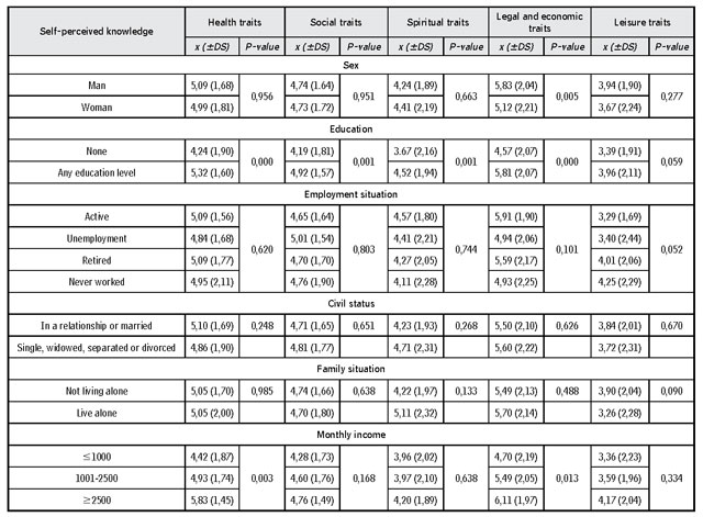 The table 2 shows the results corresponding to the relationship between the degree of self-perceived knowledge and sociodemographic aspects. It was found that a low level of education (up to primary school) is related to a lower degree of knowledge, this relationship is statistically significant (p = 0.001) in all aspects, except in leisure, where the trend is maintained in a non-significant way (p = 0,059). Likewise, in most of the aspects, men showed discreetly more knowledge, this tendency is statistically significant only in the case of the economic-legal aspects (p = 0,005). We also found an association between lower income and less knowledge, this relationship being significant in aspects of health (p = 0,003) and in economic aspects (p = 0,013). No association was found between the degree of knowledge and the employment situation, the marital status and the family situation.