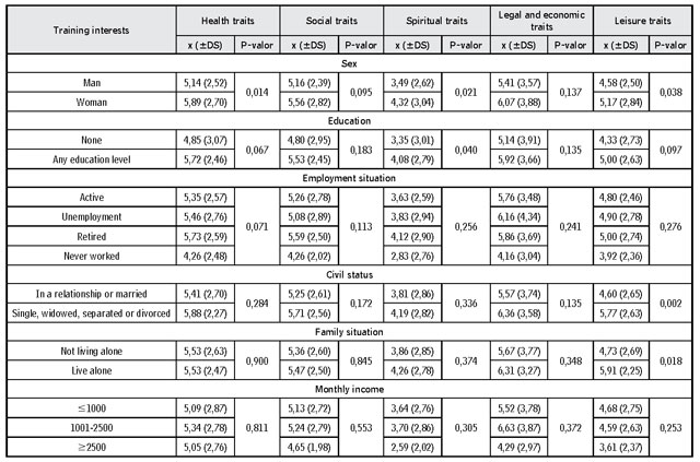 Finally, the table number 3 shows the relationship between training interests and socio-demographic aspects. There was a clear tendency to the greater formative interest from the women over the men in all the studied aspects, being this significant in aspects of health (p = 0,014), spiritual aspects (p = 0,021) and aspects of leisure (p = 0.038).