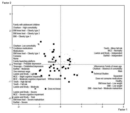 The multiple correspondence analysis shows three dimensions. The first factorial axis is defined by the presence or absence of disease and is reinforced with the self-perception of the health status; there is a marked difference shown by sick and healthy elderly. The right side of Figure 1 illustrates elderly males and the following characteristics: They have technical studies, live with a relative, have absence of comorbidity, sense no depression, are independent, and have no fall risk. The left side of the figure has principally elderly females: Widows, without academic studies and with some disease. Other aspects are also observed, like the level of cognitive impairment, low and high comorbidity, with assessment of probable depression and established depression, a level of dependence and greater fall risk.