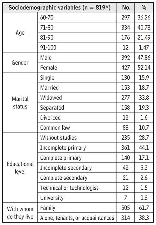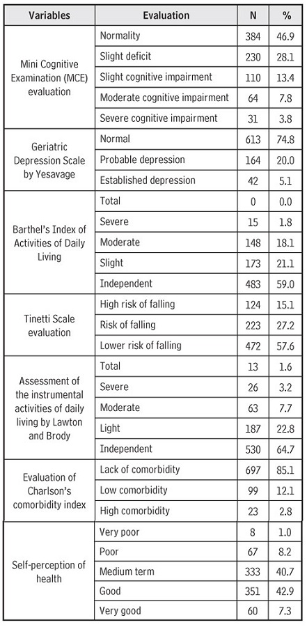 Materials and Methods: Descriptive study with quantitative variables, non-probabilistic design with selection of units by discretionary sampling, in a sample of 819 older adults. A cognitive evaluation was carried out, along with depression scale, basic activities of daily living, evaluation of gait and balance, index for the instrumental activity of daily living, and comorbidity index.