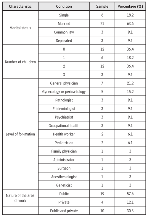 The study invited to participate 38 female physicians, of which 33 (86.8 %) were interviewed. The motives for their not participating were: Two female physicians did not accept being interviewed, and with three, in spite of their accepting, it was impossible to set an appointment, given their occupations. Participant age ranged between 29 and 60 years, with median age of 38 years, average of 39.6 years, and standard deviation of 6.7 years. They had been working between 6 and 35 years, with an average of 21 and a median of 19. Other characteristics of the participants are presented in Table 1.