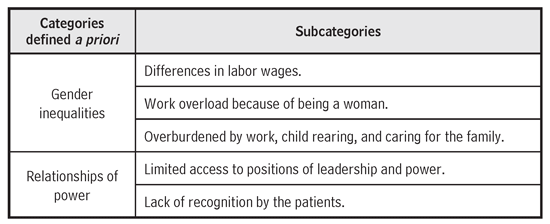 The reports of experiences lived by the participants account for the disparities in the exercise of power that point to the existence of gender inequalities regarding labor wages, hiring terms, and responsibilities assigned. All this is conjugated into invisible barriers of access to positions of power and prestige, as well as the poor recognition by patients. Table 2 summarizes the resulting categories and subcategories. The following describe the inequalities exposed, accompanied by testimonials from the participants.