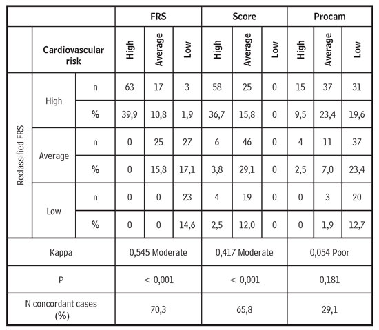 The prevalence of the high-risk category scores of the reclassified Framingham, Framingham, Procam and Score were respectively 52.5 %, 39.9 %, 12 % and 43 %. The value obtained by Procam distances more from the two FRS when compared to the Score that presented better agreement by Kappa analysis. Thus, there was a moderate agreement between reclassified FRS and Procam, as well as between reclassified FRS and FRS with statistical significance (p <0.001), but weak agreement between reclassified FRS and Procam. Probably because there is inclusion of the variables LDL, triglycerides and glycemic value in Procam that is absent in the others. In addition, the Score did not present the category of low risk, since in it the age of 60 marks the elderly in the highest stratum.