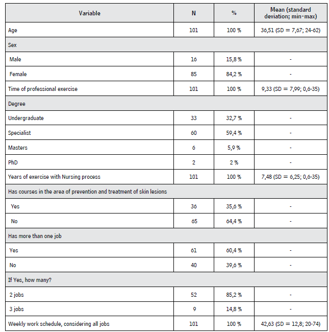 It was found that 65 nurses (64.4 %) did not have any course in the area of prevention and/or treatment of skin lesions. Regarding the number of employment ties, most subjects reported working in more than one job (60.4 %) and, of these, 52 (85.2 %) reported having two jobs. The weekly work schedule varied between 20 and 74 h per week with a mean of 42.63 h (SD = 12.8), according to the data presented in Table 1.