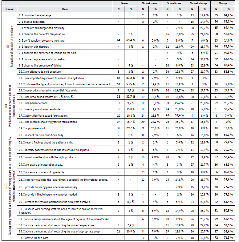 The data collection used an instrument composed of two parts: The first with sociodemographic data to identify the participants and the second with objective questions grouped into three domains and classified through a five-point Likert scale, from 1 (never), 2 (almost never), 3 (sometimes), 4 (almost always) to 5 (always). The domains were: 1. evaluation of the skin of the elderly; 2. products used to prevent and treat cutaneous xerosis; 3. nursing care prescribed in the presence of the Nursing diagnosis “impaired skin integrity related to cutaneous xerosis”.