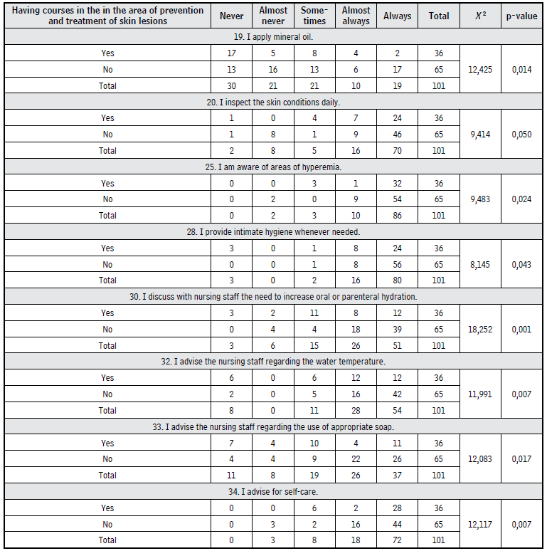 After the test, statistically significant relationships were found in items 19, 20, 25, 28, 30, 32, 33, and 34, whose p values were, respectively, 0,014, 0,050, 0,024, 0,043, 0,001, 0,007, 0,017, and 0,007. The results reveal that, at 95 % significance level, the choice for these items is independent of whether or not a course is available in the area of prevention and treatment of skin lesions.