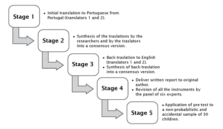 After the formal authorization by the original author of the CCQH, the first phase comprised the transcultural adaptation of the instrument for Portuguese from Portugal, according to internationally established procedures, into five stages: initial translation by two translators, synthesis of both translations, back-translation, expert panel, and pretest application 27, as verified in Figure 1. A second phase evaluated the instrument’s psychometric properties with the application of the questionnaire in Portuguese to a sample of 252 children between 7 and 11 years of age.