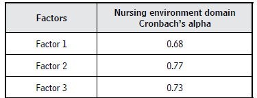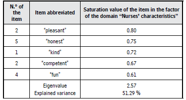 The instrument is composed by three domains: “Nurses’ characteristics”, “Nurses’ activities” and “Nursing environment”. Regarding the domain “Nurses’ characteristics”, exploratory factor analysis was conducted, using the principal component analysis method; applying the Kaiser method, having identified a factorial structure with a domain (eigenvalues ≥ 1 and saturation of the item in the factor ≥ 0.35) (Table 1).