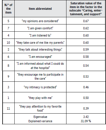In relation to the second domain, “Nurses’ activities”, in the original instrument, the author considered five subscales: “Entertainment”, “Caring and communication”, “Initiative support”, “Education”, “Physical care and treatment”. The translated version identified three subscales in this domain: “Caring, entertainment, and support”, which includes all the items of the subscales “Entertainment”, “Caring and communication”, and “Initiative support”, as well as the item “pay attention to my favorite food”, framed in the subscale “physical care and treatment” in the original instrument. The second subscale includes all the items of the subscale in the original instrument, “Physical care and treatment”, except for the item already indicated. In turn, the third subscale identified (“Education”) in this domain coincides with that in the original instrument and includes all subscale items.