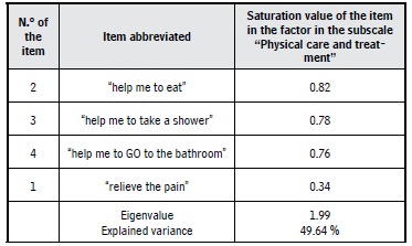 The following subscale, “Physical care and treatment”, was also subject to exploratory factor analysis and, as verified in Table 3, we confirm the one-dimensional existence, whose explained variance total is of 49.64 %.