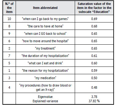 Application of the KMO test revealed a value of 0.72, within an adequate variance interval 32. Saturation of the item in the factor varies between a maximum of 0.69 in the statement “when can I go back to my games” and a minimum of 0.48 in the statement “my procedures (how to draw blood or get an X-ray)”. The Cronbach’s alpha coefficient value is 0.82, which permits considering that the subscale has good internal consistency 33.