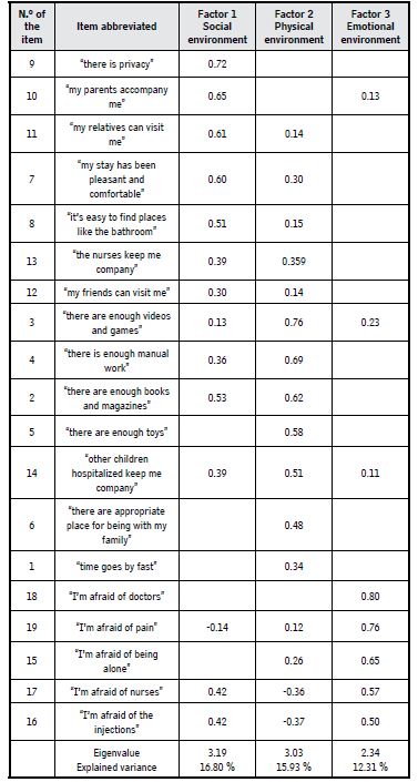 Materials and Methods: content, language, and conceptual validity methodological study, with translation, feedback, and reflection. A non-probabilistic simple was used of 252 children between 7 and 11 years of age, hospitalized due to acute disease in nine services of six Portuguese hospitals. The reliability and validity of the results were determined to measure the psychometric properties of the instrument. Construct validity was calculated through exploratory factor analysis of main components with Varimax rotation and the internal consistency by determining the Cronbach’s alpha coefficient.
