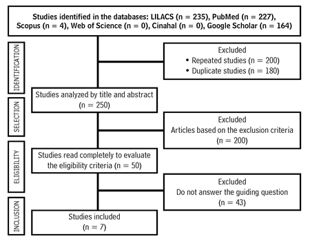 The study initially identified 630 articles; of these, 380 were excluded because they were duplicated in the databases. Thus, 250 articles were selected to read the title and abstract, which resulted in a sample of 50 articles for full-text reading. Of these, 43 were excluded for not answering the guiding question, which lead to a total of seven articles (Figure 1). Four studies were conducted in the United States, two in Europe, and one in Brazil.
