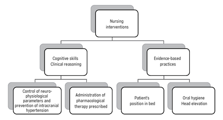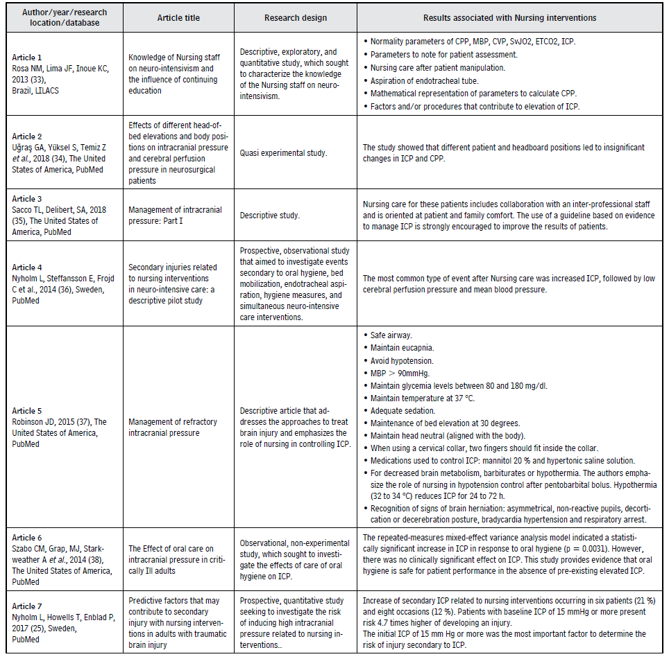 Results: the sample was comprised of seven articles fulfilling the inclusion criteria. Two thematic categories were established for the Nursing interventions aimed at patients with intracranial hypertension: cognitive skills and clinical reasoning, necessary to control neuro-physiological parameters and prevent intracranial hypertension, and evidence-based practices to improve care for neuro-critical patients.