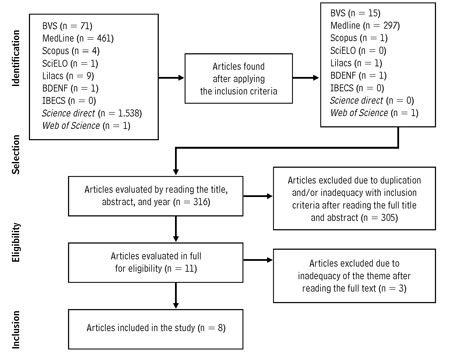 The review was constructed by using the PICO strategy, methodological acronym to refer to the following elements: problem, intervention, control or comparison and outcome. It is a systematic method that aids in identifying relevant key words for the theme and, consequently, increases the possibility of finding studies strictly related to the research question, which reduces bias and avoids unnecessary searches 42,43.