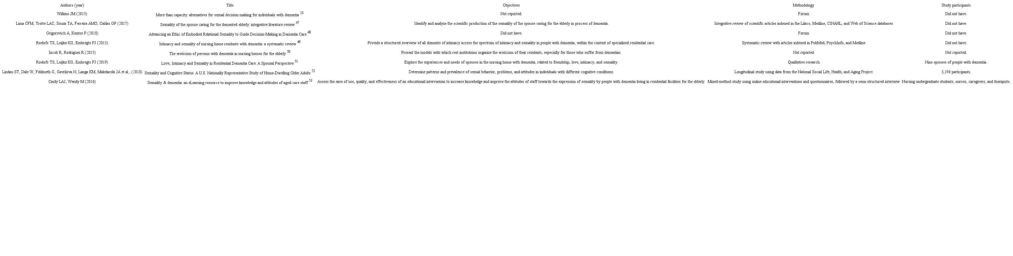 The analysis of the selected studies showed a scientific gap on the subject, given that merely 2.5 % were eligible to answer the proposed objective 23,47,48,49-53. It was also identified that most research (75 %) addressed the sexuality in the elderly with or without dementia who live in homes for the aged 23,48,49-52. The other characteristics of the studies are described in Tables 1 and 2.
