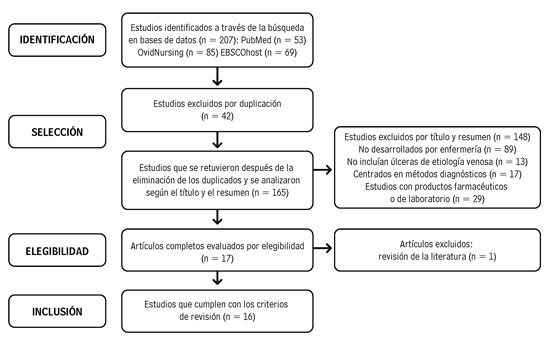 According to their content, 207 studies were found, of which 42 were discarded due to duplication in the databases; then, the titles and abstracts of the remaining articles were revised, according to the inclusion and exclusion criteria; finally, three reviewers, through consensus, kept 16 articles in the review.